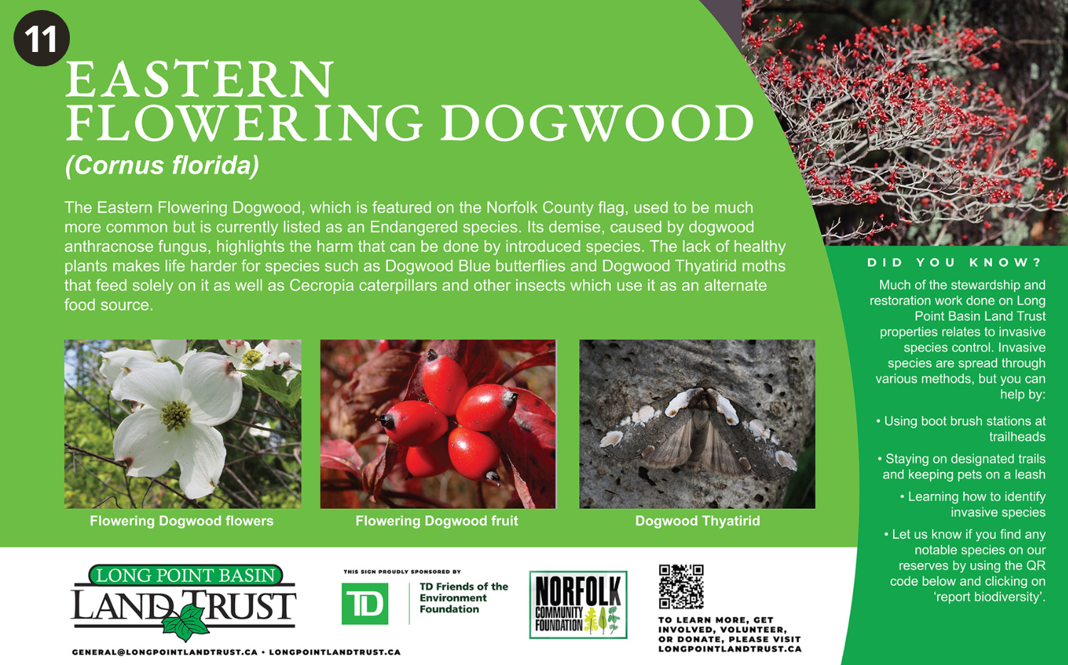 The Eastern Flowering Dogwood, which is featured on the Norfolk County flag, used to be much more common but is currently listed as an Endangered species. Its demise, caused by dogwood anthracnose fungus, highlights the harm that can be done by introduced species. The lack of healthy plants makes life harder for species such as Dogwood Blue butterflies and Dogwood Thyatirid moths that feed solely on it as well as Cecropia caterpillars and other insects which use it as an alternate food source.