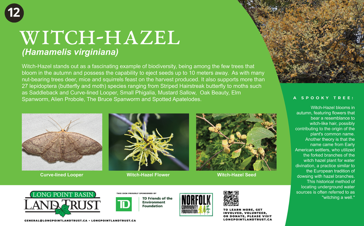 Witch-Hazel stands out as a fascinating example of biodiversity, being among the few trees that bloom in the autumn and possess the capability to eject seeds up to 10 meters away. As with many nut-bearing trees deer, mice and squirrels feast on the harvest produced. It also supports more than 27 lepidoptera (butterfly and moth) species ranging from Striped Hairstreak butterfly to moths such as Saddleback and Curve-lined Looper, Small Phigalia, Mustard Sallow, Oak Beauty, Elm Spanworm, Alien Probole, The Bruce Spanworm and Spotted Apatelodes.