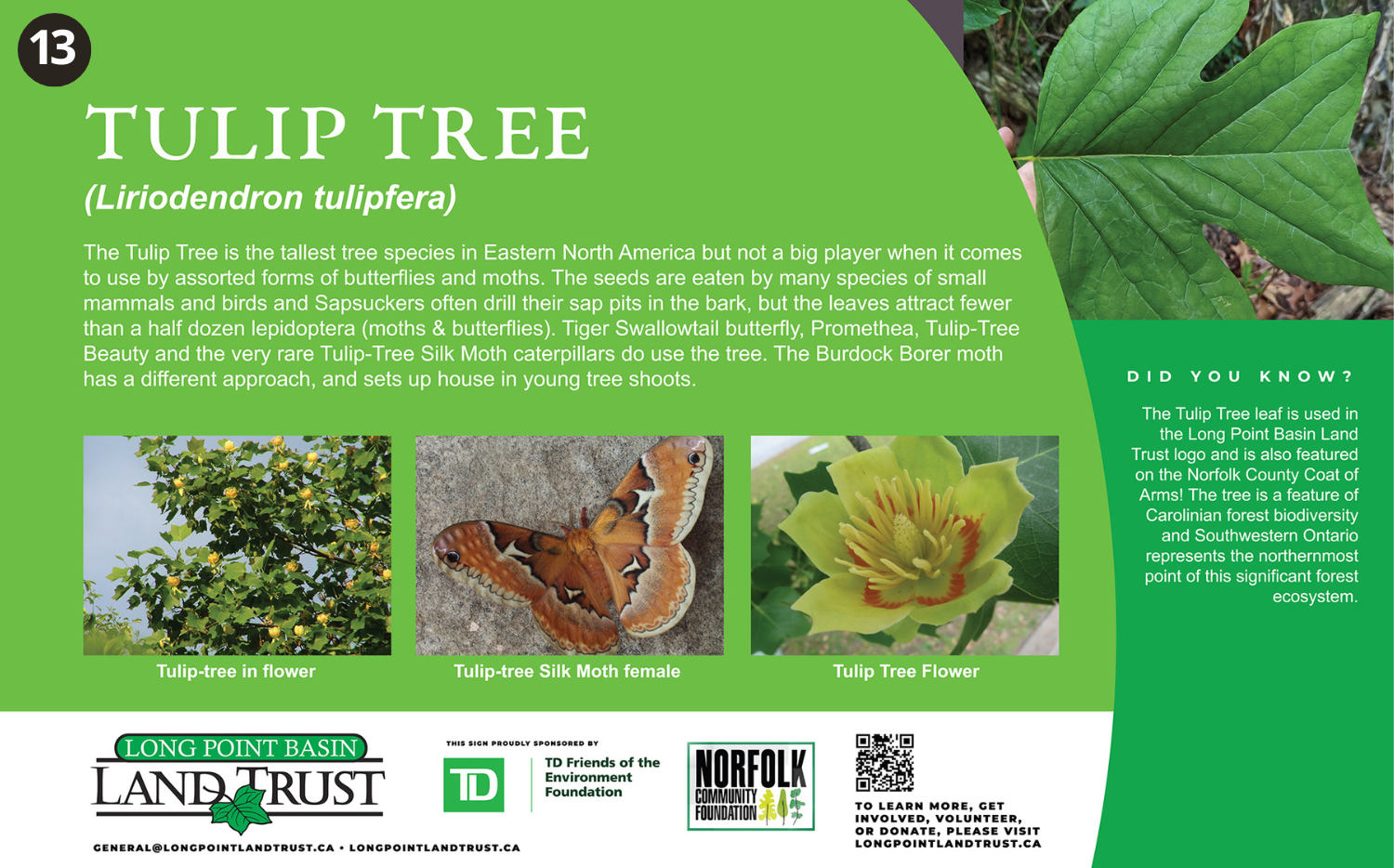 The Tulip Tree leaf is used in the Long Point Basin Land Trust logo and is also featured on the Norfolk County Coat of Arms! The tree is a feature of Carolinian forest biodiversity and Southwestern Ontario represents the northernmost point of this significant forest ecosystem.