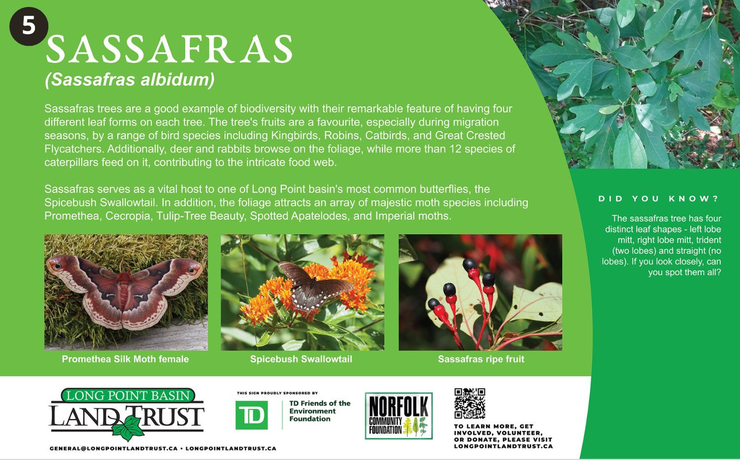 Sassafras serves as a vital host to one of Long Point basin’s most common butterflies, the Spicebush Swallowtail. In addition, the foliage attracts an array of majestic moth species including Promethea, Cecropia, Tulip-Tree Beauty, Spotted Apatelodes, and Imperial moths. The sassafras tree has four distinct leaf shapes – left lobe mitt, right lobe mitt, trident (two lobes) and straight (no lobes). If you look closely, can you spot them all?