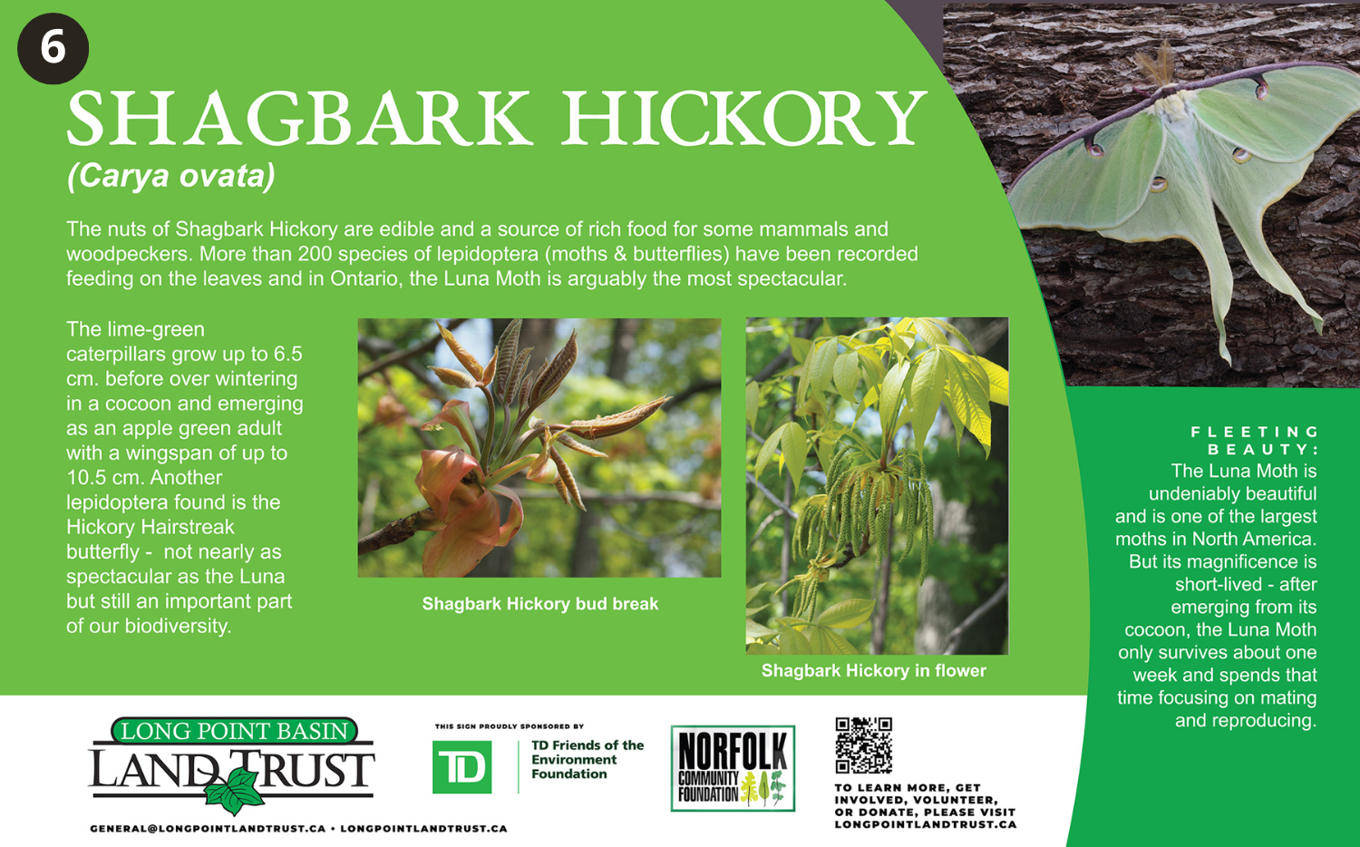 The nuts of Shagbark Hickory are edible and a source of rich food for some mammals and woodpeckers. More than 200 species of lepidoptera (moths & butterflies) have been recorded feeding on the leaves and in Ontario, the Luna Moth is arguably the most spectacular.’