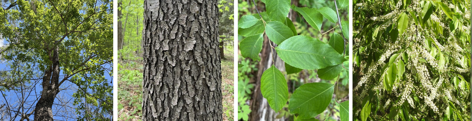 The leaves of Black Cherry are oval and arranged alternately on the twig, 5-13 cm in total size, with finely toothed margins. The top of the leaf is dark green, while the underside is much lighter. In the autumn, Black Cherry foliage becomes vibrant red or orange. White flowers emerge in May, consisting of 5 petals on stalks 10-15 centimetres long. Afterwards, the fruits emerge as clusters of reddish-black drupes. The scientific name (serotina) refers to the timing of fruit ripening, which occurs in September. The bark of Black Cherry is the most important identification feature – on mature trees, it consists of squarish plates which resemble the scales of a snake. Black Cherry bark is also much darker than most of Ontario’s other hardwoods, making it readily identifiable in the field. If the foliage or bark is crushed, it gives out an aroma similar to almonds.