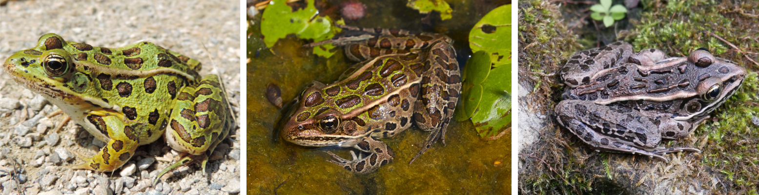 Northern Leopard Frogs are large frogs, growing up to 11 cm in length. They are characterized by their smooth skin, which is usually green or brown, adorned with distinctive dark, irregular spots that are often surrounded by a lighter halo. A prominent light-colored dorsolateral fold (a raised ridge of skin) runs along each side of their back, extending from behind the eye to the groin. Their belly is typically white or pale green. Males are generally smaller than females and possess vocal sacs that inflate during their breeding calls. The tadpoles of Northern Leopard Frogs are greenish-brown and can grow relatively large before metamorphosis. Leopard Frogs widely vary in visual appearance, with a green morph, a brown morph, and a burnsi morph. Frogs of both the green and brown morphs possess black spots on their back reminiscent of a leopard, whereas the burnsi morph lacks dorsal spots, and may possess spots on their legs.