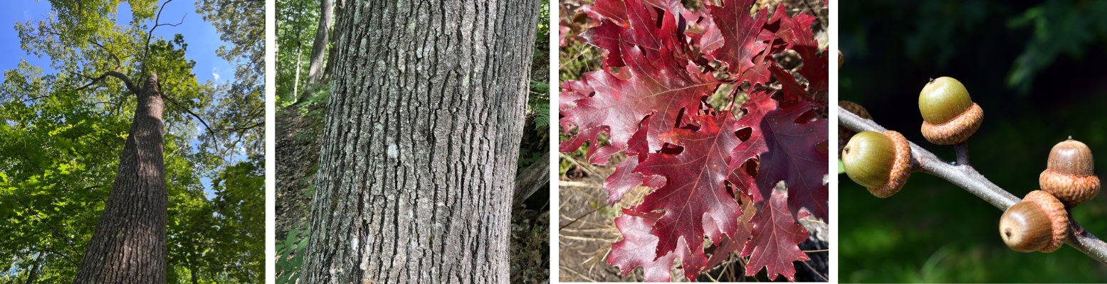The Long Point Basin has 8 species of oaks, distributed widely across many different ecosystems, from oak savannas (displayed in the rightmost photo) to swampy woodlands! These oaks are categorized into two major groups – red oaks (Quercus section Lobatae) and white oaks (Quercus section Quecus), with a few notable differences in the fruit structure and leaf morphology. For species in the white oak group, it takes one year for an acorn to fully mature, while red oak acorns require two years to mature. White oak acorns are sweet, and red oak acorns are bitter. All of Ontario’s species in the red oak group have pointed leaf lobes, whereas species of the white oak group have smooth leaf lobes. Black Oak (Quercus velutina), Northern Red Oak (Quercus rubra), and Northern Pin Oak (Quercus ellipsoidalis) are part of the red oak group, whereas White Oak (Q. alba), Bur Oak (Quercus macrocarpa), Swamp White Oak (Quercus bicolor), Chinquapin Oak (Quercus muehlenbergii) and Dwarf Chinquapin Oak (Quercus prinoides) are in the white oak group.