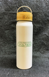 White stainless steel water bottle with logo and bamboo wooden lid